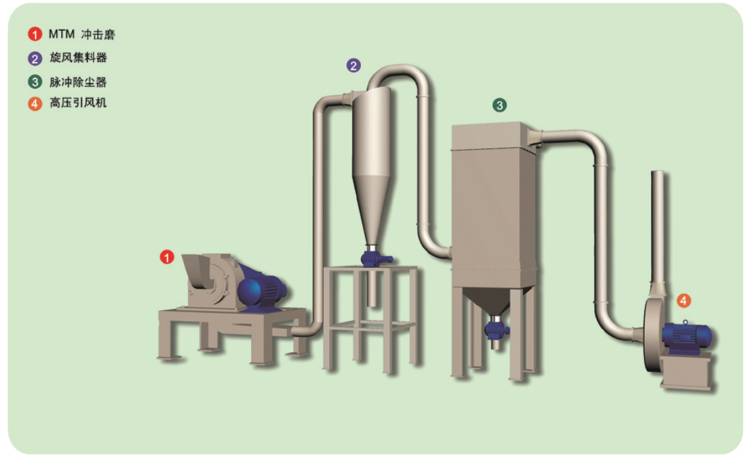 转子、定子组成封闭粉碎腔。当物料经加料装置送入粉碎腔后,在转子高速旋转作用下,物料也跟随加速旋转,同时在离心力作用下向外周方向运动。在此过程中,物料与转子及定子上的销棒之间发生强烈碰撞而被粉碎,并且越往外粉碎程度越剧烈。由于转子和定子各有3层销棒圈,所以物料的粉碎作用较为充分,使得出料细度理想、粒径均匀。在这粉碎过程中,粉碎区吸入了大量的空气,起到了冷却机器、磨料、输送物料的目的。