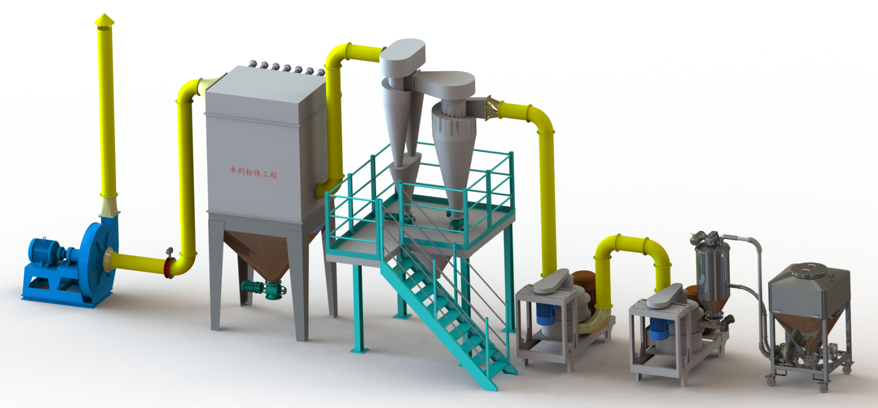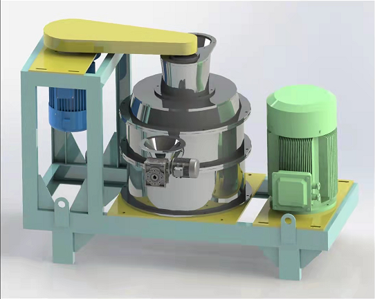 本机的机腔为圆筒形,由一环形将其分为上下两部分,下部分为进气室,上部分由分流环分隔成粉碎室和分级室。粉碎室将物料击碎成细粉后进入分级室,分级室能把细粉分成粒度达标和未达标两种规格,达标细粉经出料管吸出,由旋风集料器收集产品。未达标的细粉沿分流环内壁回落到粉碎室,继续粉碎,直到达标为止。