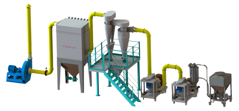 该机主要由加料斗、上箱体、下箱体、转子、锤片、筛网、机架、出料口等部件组成。粉碎机工作时,电动机带动主轴即转子(转子四周均布有若干片锤片)高速旋转。锤片与定子组成的粉碎区结构紧凑,使进入机器的物料在旋转气流中紧密地摩擦和强烈地冲击到锤片上,并在锤片与定子之间的缝隙中再次研磨。在这过程中,转子吸进大量的空气,起到冷却机器、磨料、传送细粉的目的。物料粉碎细度取决于物料的性质和筛网的尺寸,以及物料空气的通过量。